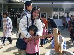 もちつき大会 平成12年2月9日 2/9は育友会主催の『もちつき大会』。なかなか体験することのなくなった石臼と杵を使ったもちつきを園児全員で楽しみました。