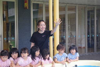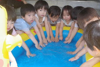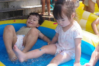 暑い日の水遊びはとにかく最高。 お日さまも冷やしてあげたい? そして遊戯室の表側では