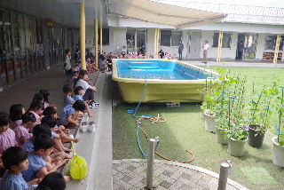 R7プール遊び 待ちに待ったプール開き。本当に今日が楽しみでした。 プール開きでは毎年お清めの塩を撒いてプール遊びの『無事故』を祈願します。 ついでに、家内安全から天下太平、疫病退散、縁結びまでお願いされるなぎさ 幼稚園のプールの神様、毎年願いを叶えて頂きありがとうございます。 遊戯室裏でちゅうりっぷ、たんぽぽ専用水遊びプール開き。 裏と言うと日陰のイメージですが、こちらが南側。日射しが凄い。