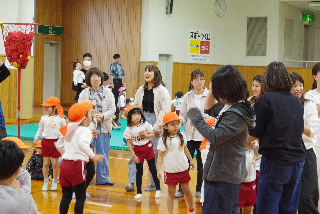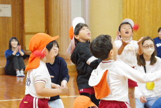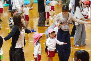 みんなでゲーム、今年はみんなで玉入れです。 たんぽぽ組が見事なダンクシュート。?????
