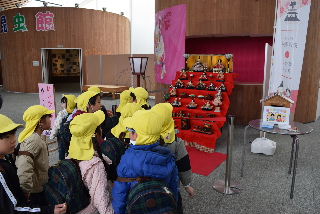 昭和のお雛様、豪華7段飾り。向こうに見える昆虫館入り口内部の蝶の標本は一見の価値有り!