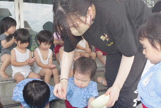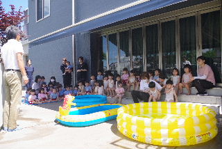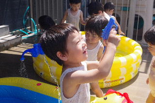 暑い日の水遊びはとにかく最高。 お日さまも冷やしてあげたい? そして遊戯室の表側では