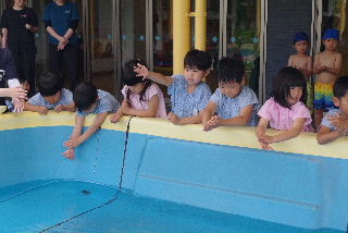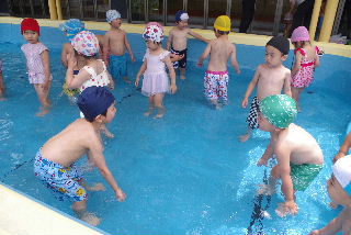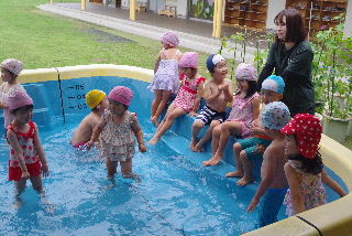 R7プール遊び 待ちに待ったプール開き。本当に今日が楽しみでした。 プール開きでは毎年お清めの塩を撒いてプール遊びの『無事故』を祈願します。 ついでに、家内安全から天下太平、疫病退散、縁結びまでお願いされるなぎさ 幼稚園のプールの神様、毎年願いを叶えて頂きありがとうございます。 遊戯室裏でちゅうりっぷ、たんぽぽ専用水遊びプール開き。 裏と言うと日陰のイメージですが、こちらが南側。日射しが凄い。