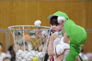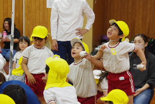 みんなでゲーム、今年はみんなで玉入れです。 たんぽぽ組が見事なダンクシュート。?????
